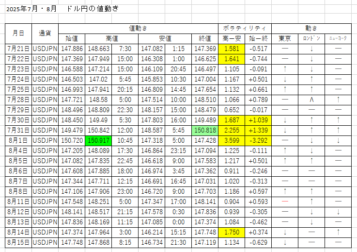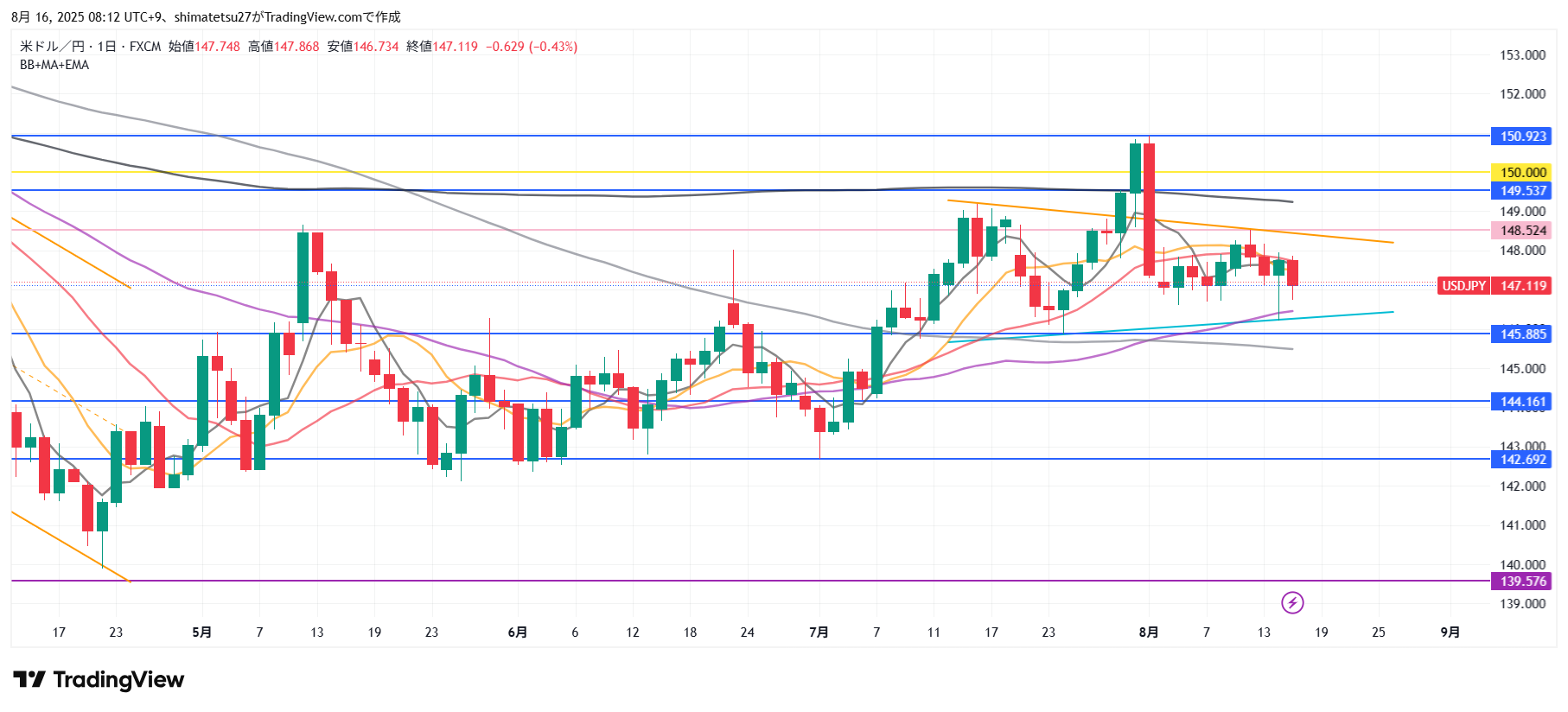 ドル円の日足チャート。8/16 6:00のレートは147.11。再び円高となるもまたレンジ。意識される直近安値は7/24の145.88となっています。次の意識される上のラインは、7/16高値の149.17となります。