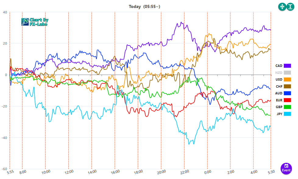 上グラフは通貨強弱。ニューヨーク時間前にドル高円安となっている。