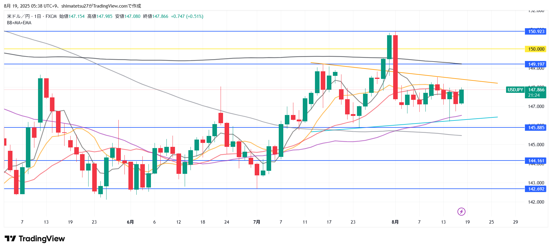 ドル円の日足チャート。8/18 7:00のレートは147.85。意識される直近安値は7/24の145.88となっています。次の意識される上のラインは、7/16高値の149.17となります。