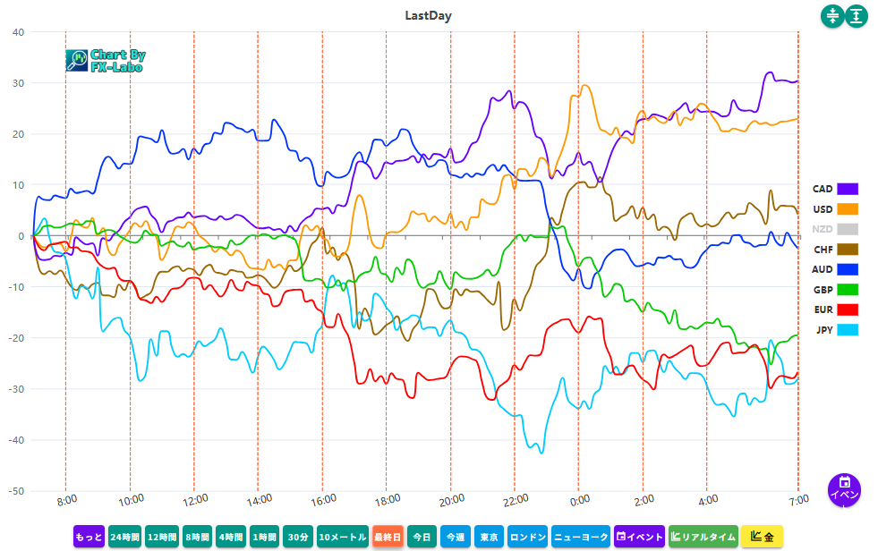 上グラフは通貨強弱。ニューヨーク時間前にドル高円安となっている。