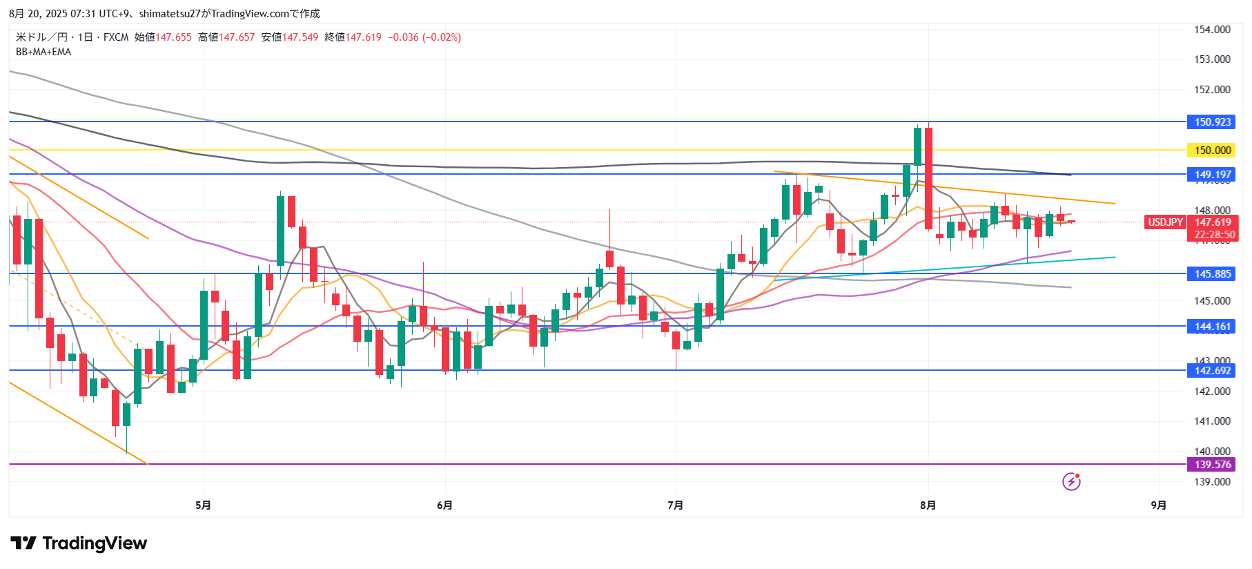 ドル円の日足チャート。8/20 7:00のレートは147.66。意識される直近安値は7/24の145.88となっています。次の意識される上のラインは、7/16高値の149.17となります。