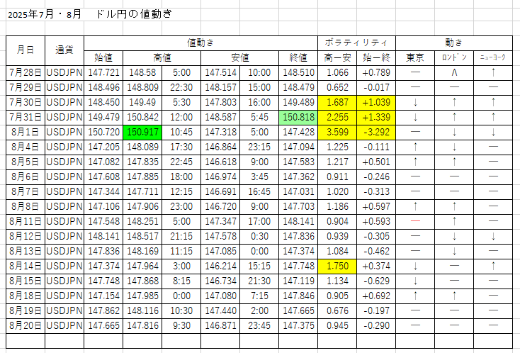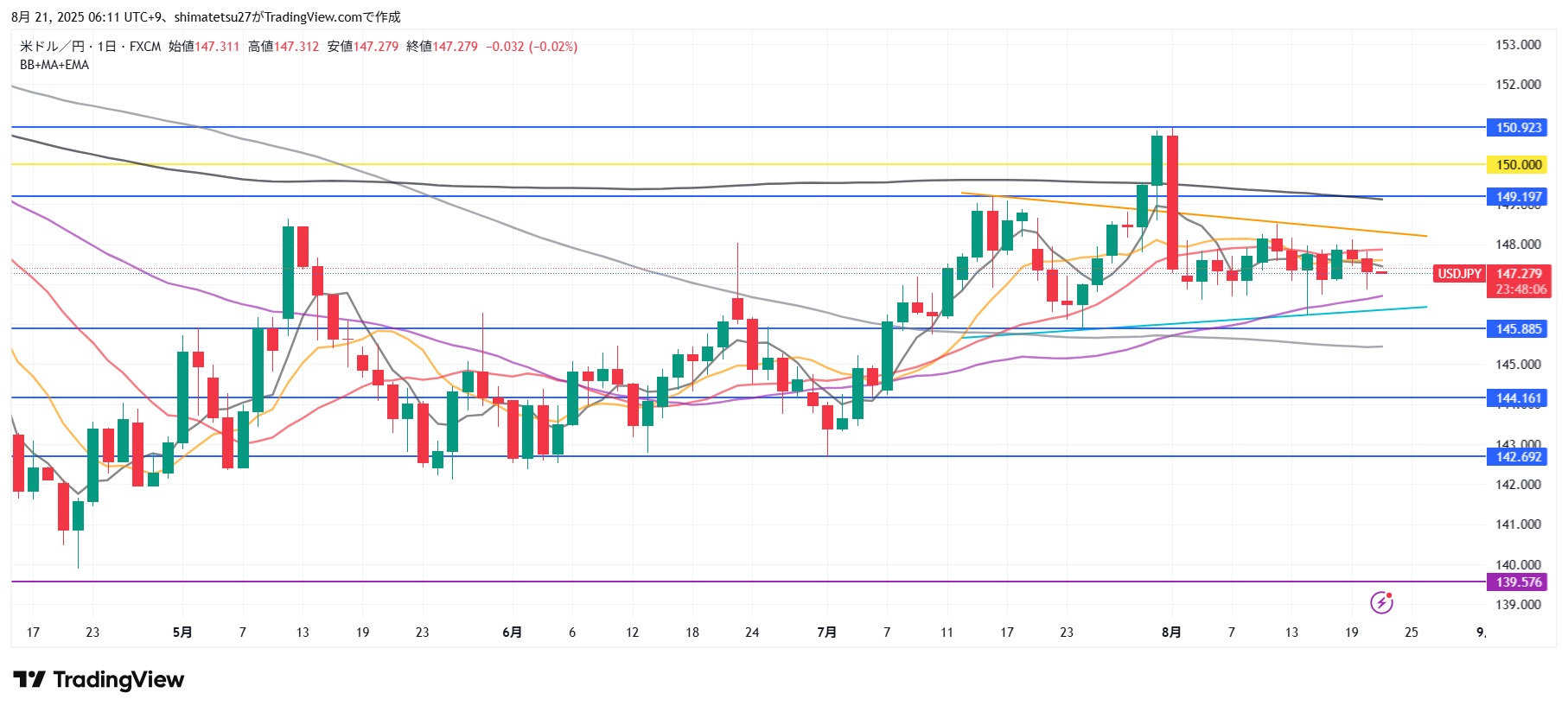 ドル円の日足チャート。8/21 6:00のレートは147.28。意識される直近安値は7/24の145.88となっています。次の意識される上のラインは、7/16高値の149.17となります。