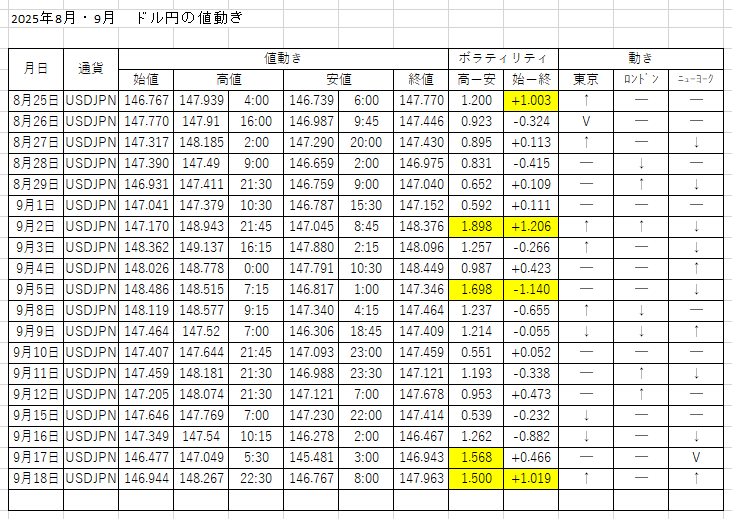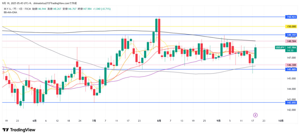 ドル円の日足チャート。9/19 6:00のレートは147.99。意識される直近安値は7/24の145.88となっています。次の意識される上のラインは、7/16高値の149.17となります。また、レンジ内に戻りました。このレンジは8月雇用統計の前後日を除いて約2か月以上続いています。