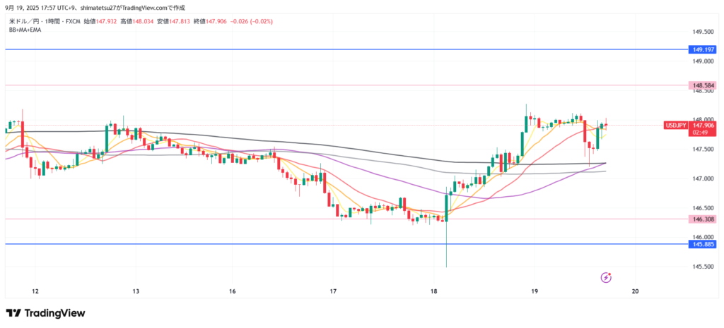 上はドル円の9/12からの1時間足です。18:00現在147.88。上限148.58 下限146.31 となります。FOMC前のレンジに戻りました。