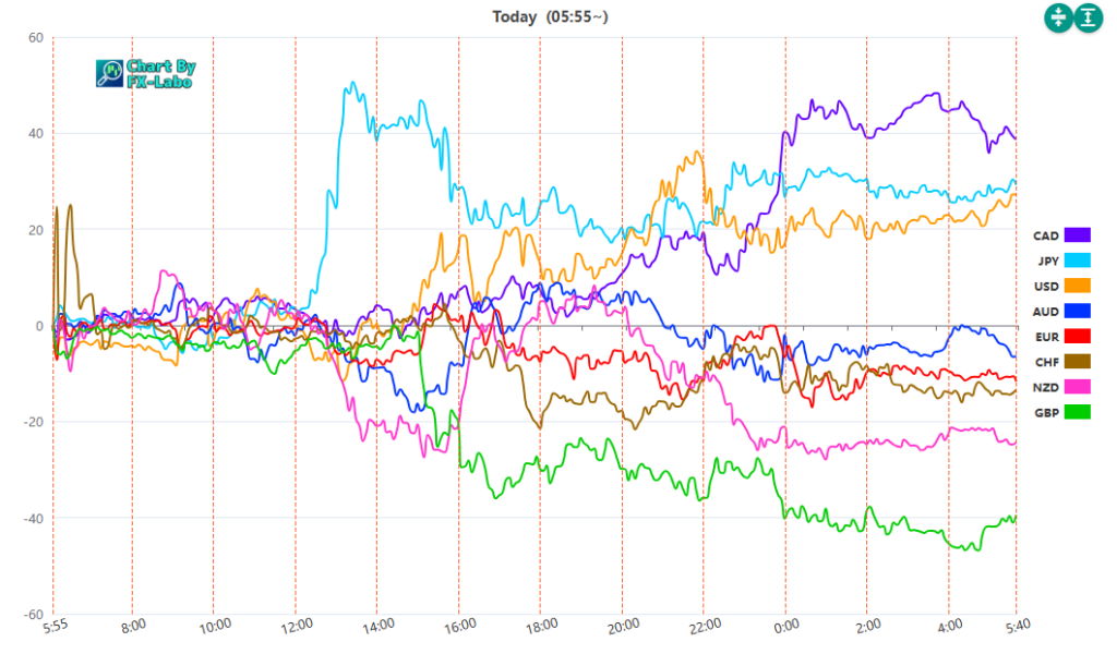 上図は9/19の通貨強弱。日銀の政策金利が発表されると円高に総裁会見後やや円安方向になりました。また、ロンドン時間以降はポンドが売られました。