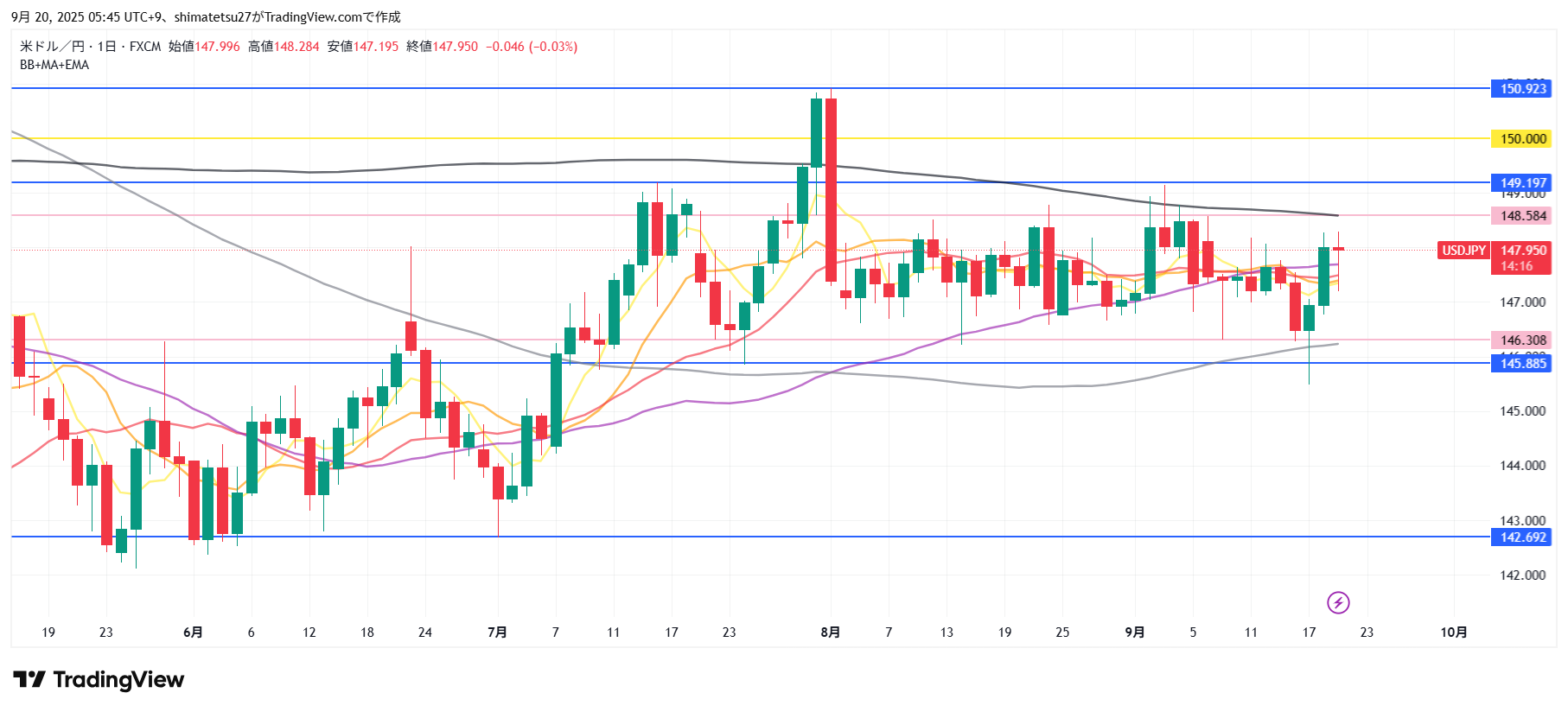 ドル円の日足チャート。9/20 6:00のレートは147.95。意識される直近安値は7/24の145.88となっています。次の意識される上のラインは、7/16高値の149.17となります。また、レンジ内に戻りました。このレンジは8月雇用統計の前後日を除いて約2か月以上続いています。