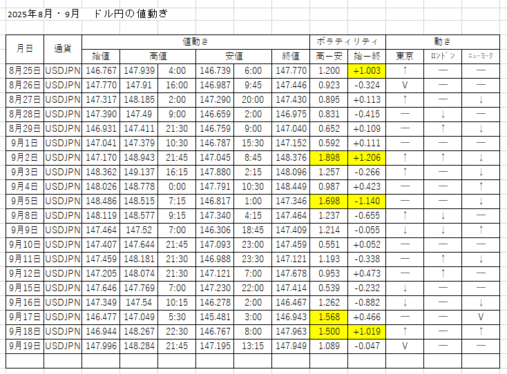 9/5の米雇用統計の結果は、労働環境は悪化していることが確認されました。米PPI、米CPIはドル高の材料が少なく、9/17日のFOMCでの利下げは-0.25%となり、予想通りでした。今後の見通しは年内2回、次年1回の見通しとなり大口の見通しより「タカ」となりました。
