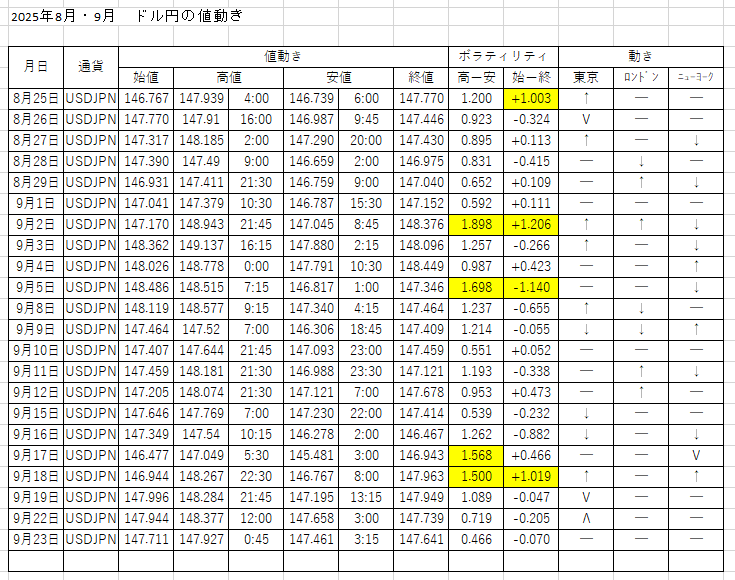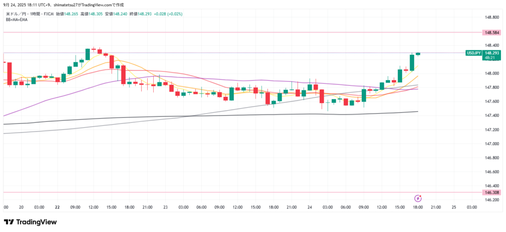 上はドル円の9/15からの1時間足です。18:00現在147.88。上限148.58 下限146.31 となります。FOMC前のレンジに戻りました。