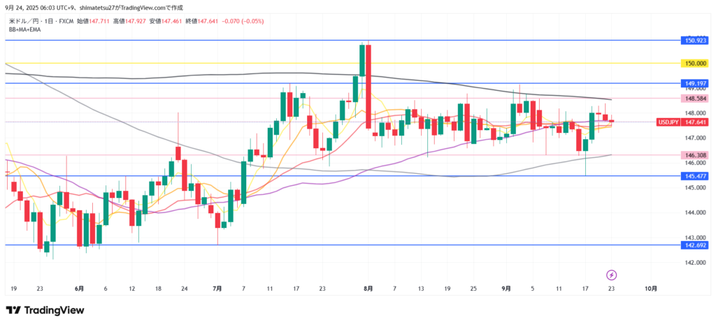 ドル円の日足チャート。9/24 6:00のレートは147.64。意識される直近安値は9/17の145.47となっています。次の意識される上のラインは、7/16高値の149.17となります。また、レンジ内に戻りました。このレンジは8月雇用統計の前後日を除いて約2か月以上続いています。