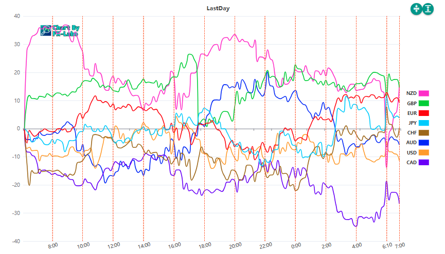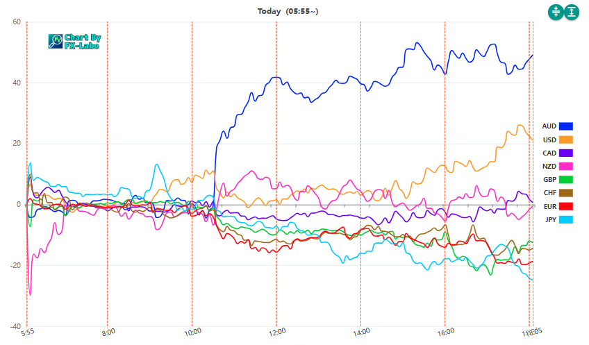 上グラフは本日ここまでの通貨強弱。主要通貨は小動き。