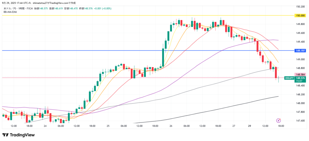 現状でドル円は東京時間開始から、約0.9円下落しています。日銀の野口氏の発言(ややタカ)や米政府の閉鎖懸念などが要因として考えられます。また、以前のレンジに戻ったことと月末ということもあり方向感に欠けています。トレードするならスキャル感覚で早めの利確、損切でおこないたいところです。