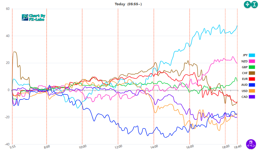 上は、1日 18時の通貨強弱。ドル安・円高となっています。