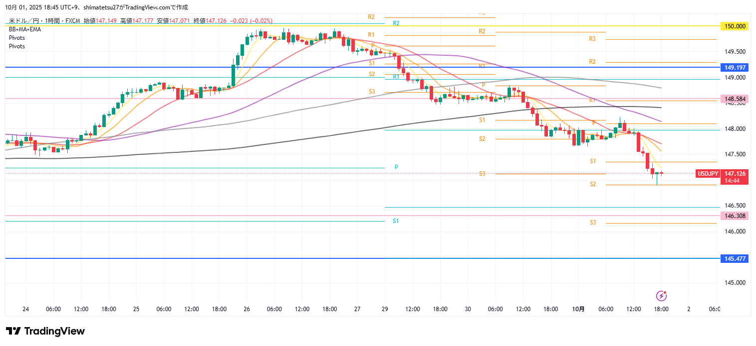 ドル円の1時間足チャート。10/1 18:00のレートは147.15。デイトレで意識される上限は148.58、下のラインは146.30。チャートはデイリーピボットS2付近です。
