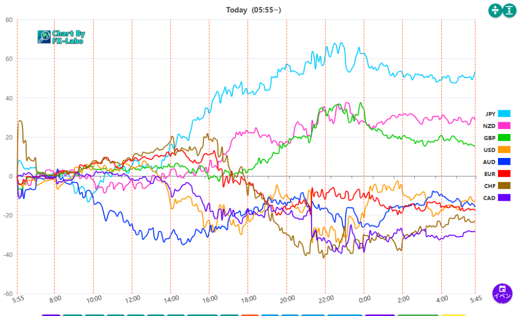 上は、30日の通貨強弱。ドル安・円高となっています。