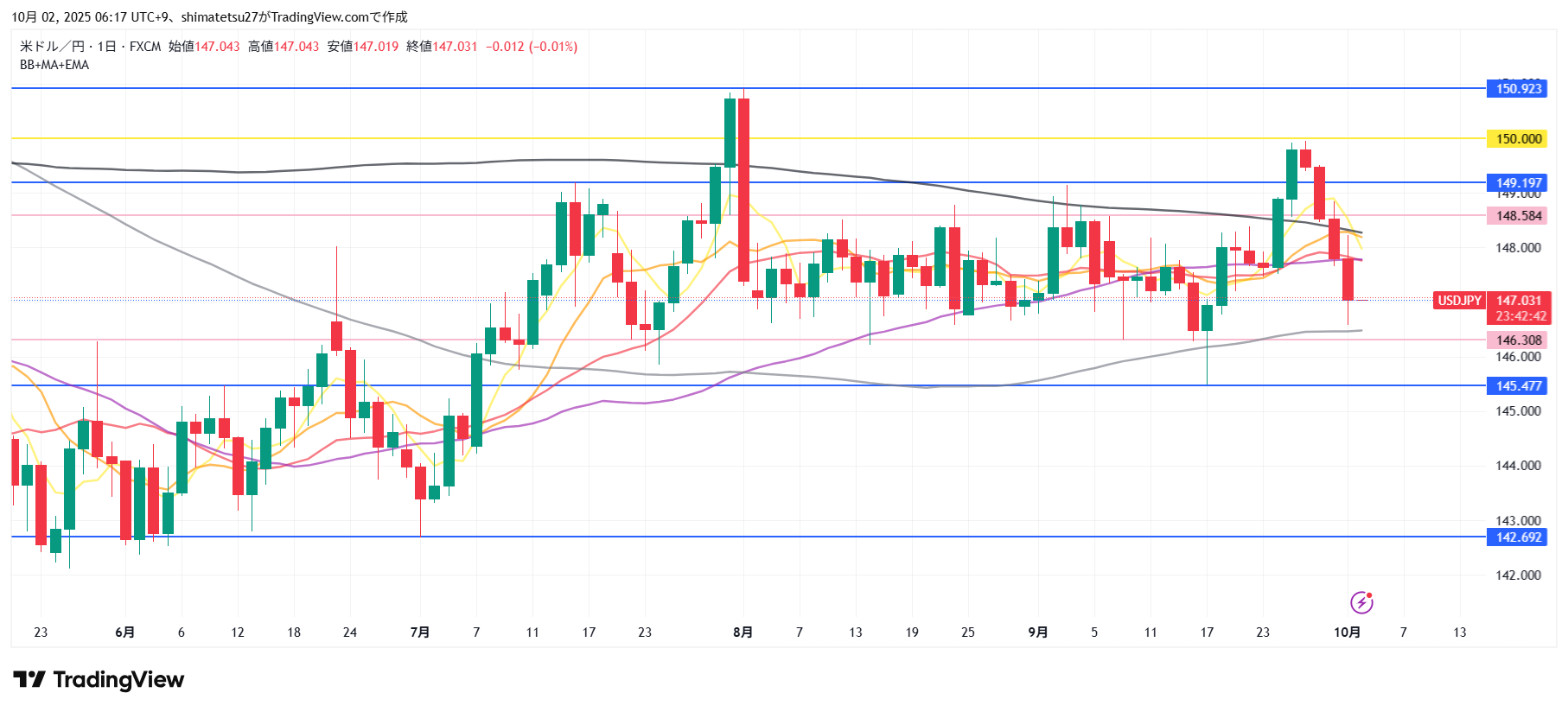 ドル円の日足チャート。10/2 6:00のレートは147.03。元のレンジの中央付近。意識される直近安値は9/17の145.47となっています。次の意識される上のラインは、9/3高値の149.19となります。レンジは7月から8月雇用統計、9月末付近を除いて2か月以上続いています。