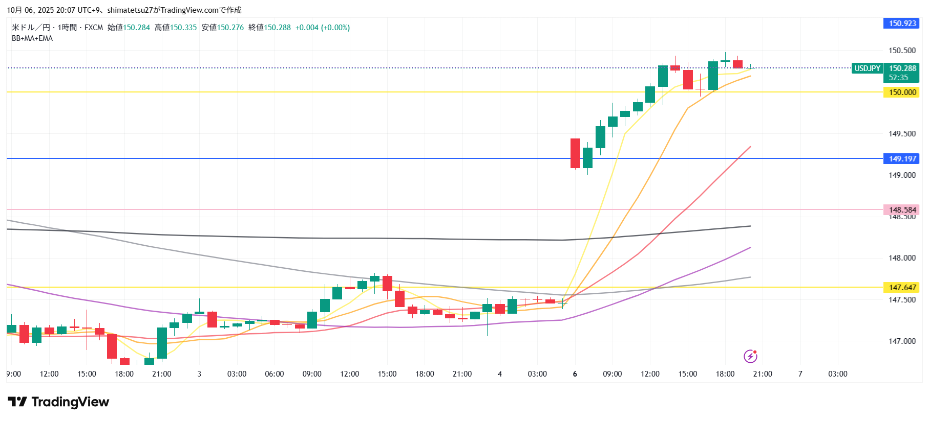 ドル円の1時間足チャート。10/6 17:00のレートは150.36。デイトレで意識される上限は150.92、下のラインは149.19。