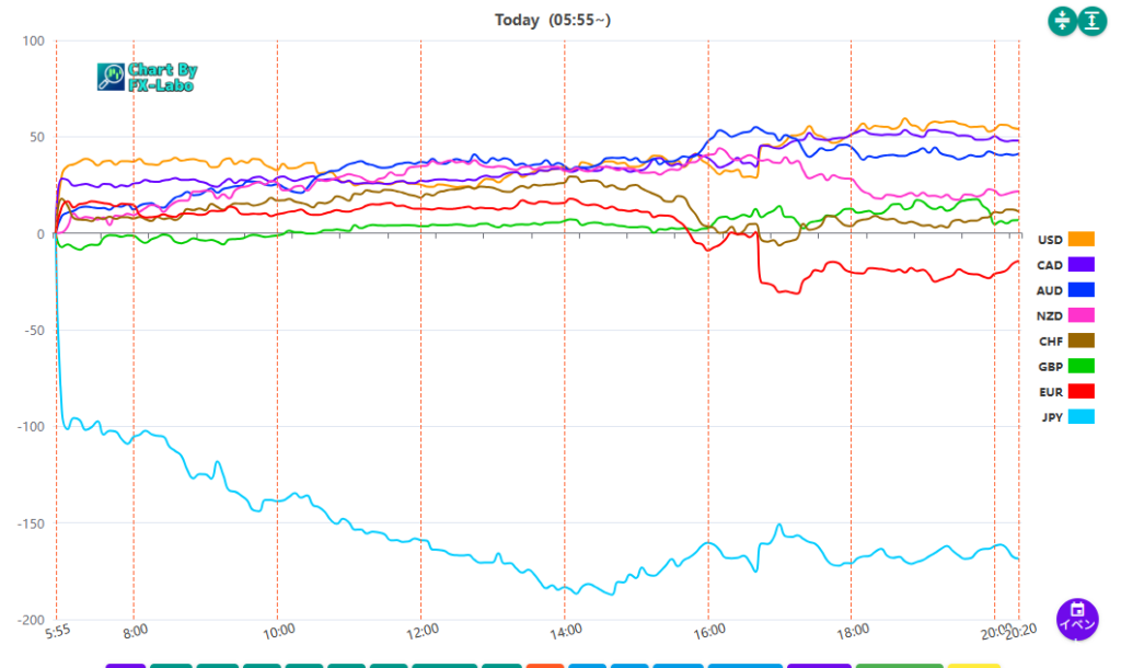 上は、6日 20時の通貨強弱。すごい円安ですね。