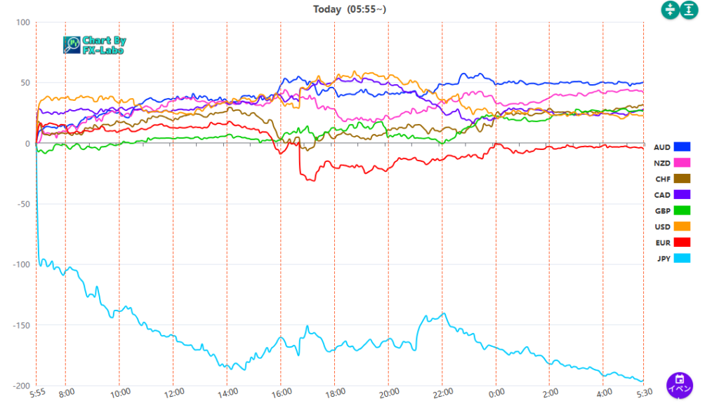 上は、6日の通貨強弱。すごいドル安です。よく見ると東京時間は円が売られ続け、ロンドン時間はレンジ、NY時間は一旦円買いがあってから円売りとなっています。他に有力なファンダメンタルズがなく、値動きは読みにくかったです。