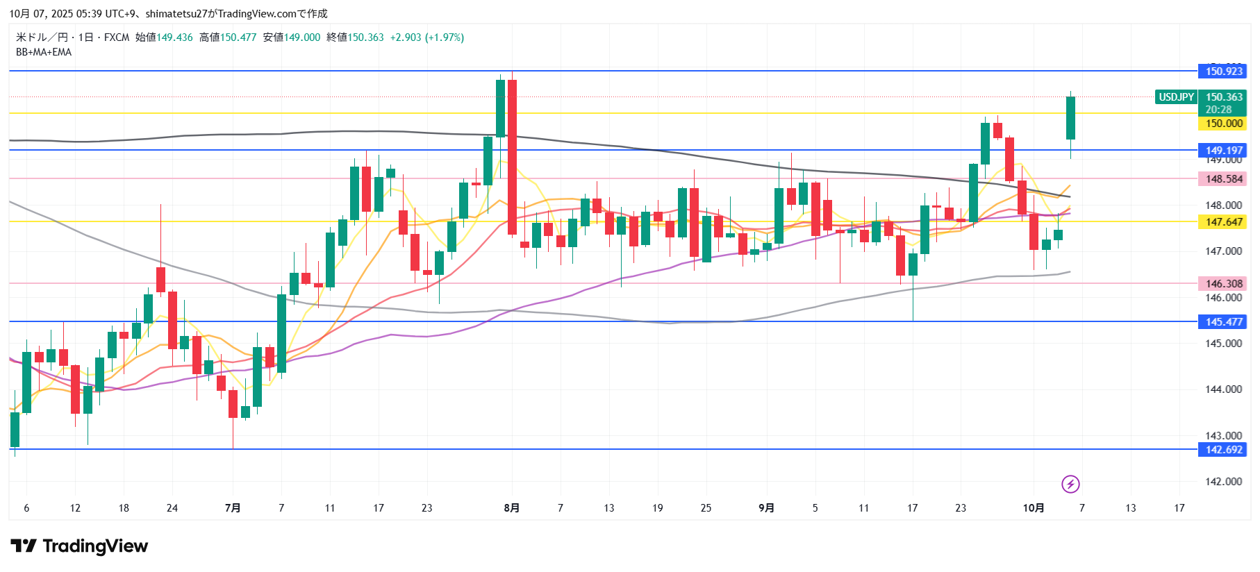 ドル円の日足チャート。10/7 6:00のレートは150.36。高市トレードとなり一気にレンジをブレイクしました。次に意識される上のラインは150.93.下ラインは、9/3高値の149.19となります。