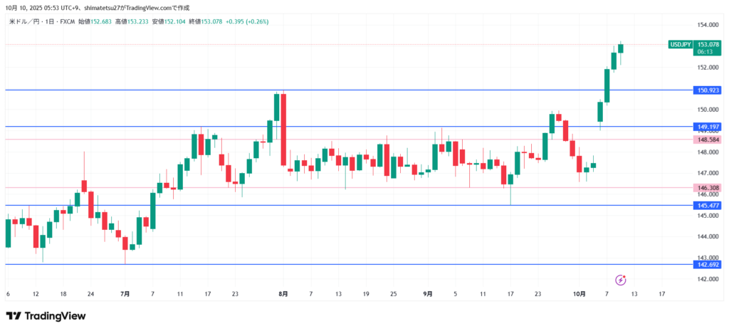 ドル円の日足チャート。10/9 6:00のレートは152.66。一気に上限レンジをブレイクし、さらに上昇。次に意識される上のラインは154.81.下ラインは、9/3高値の149.19となります。