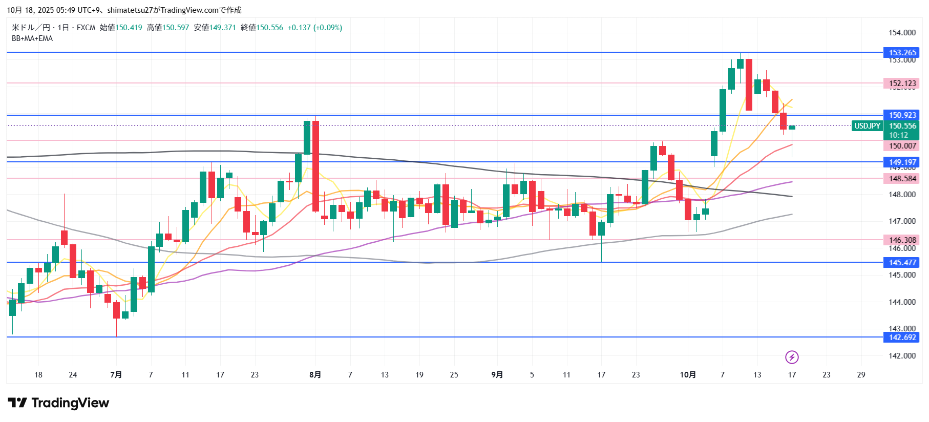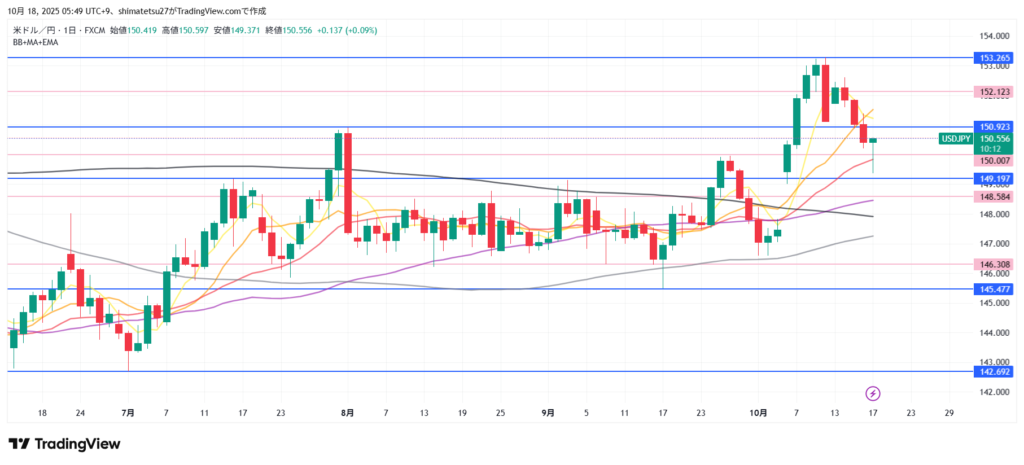 ドル円の日足チャート。10/17 6:00のレートは150.40。次に意識される上のラインは153.26.下ラインは149.19となります。