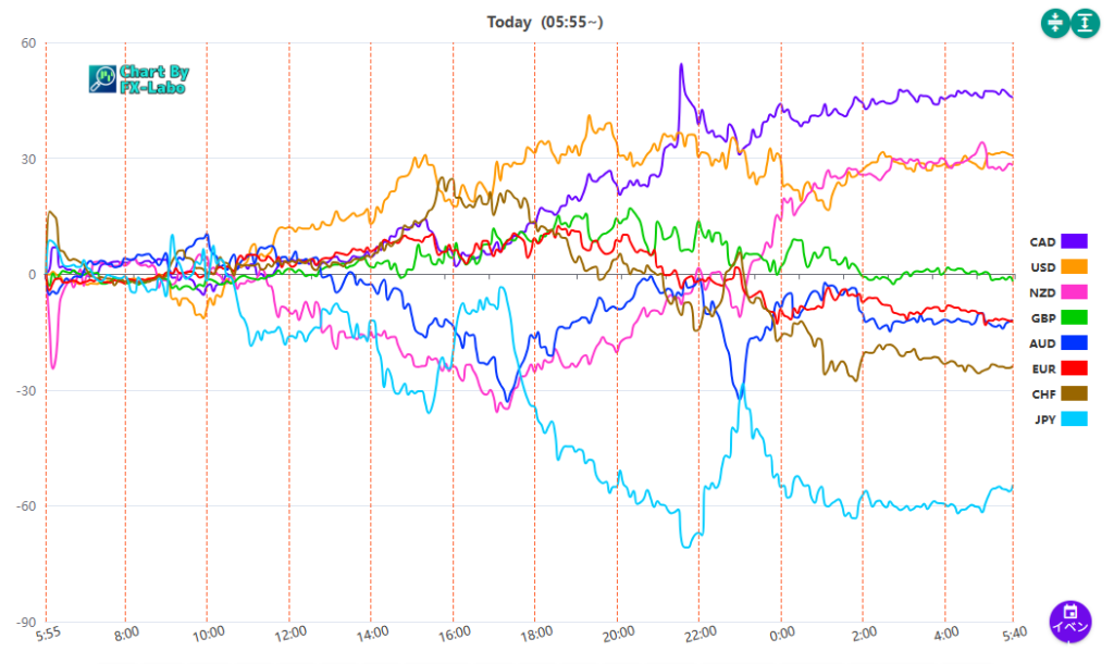 上は、21日の通貨強弱。円は売りと買戻しで全体として円安でした。