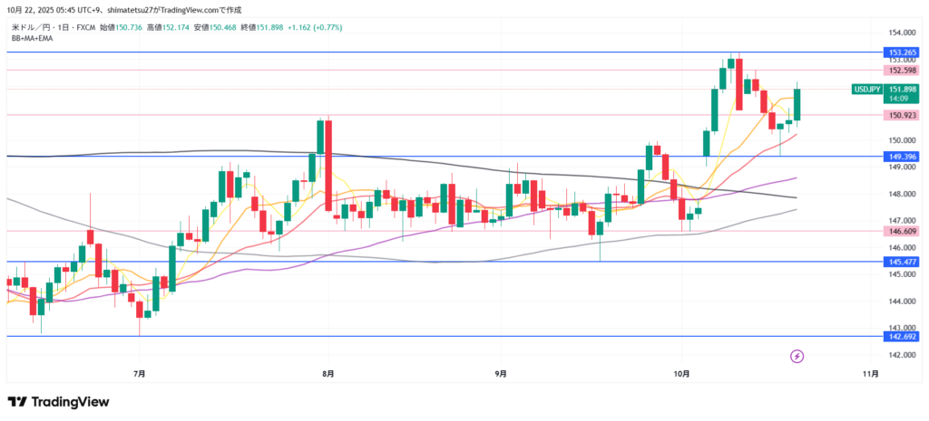 ドル円の日足チャート。10/22 6:00のレートは150.90。次に意識される上のラインは153.26.下ラインは149.39となります。