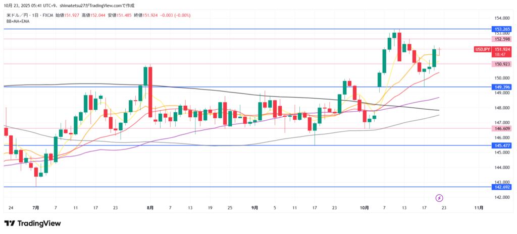 ドル円の日足チャート。10/23 6:00のレートは151.92。次に意識される上のラインは153.26.下ラインは149.39となります。