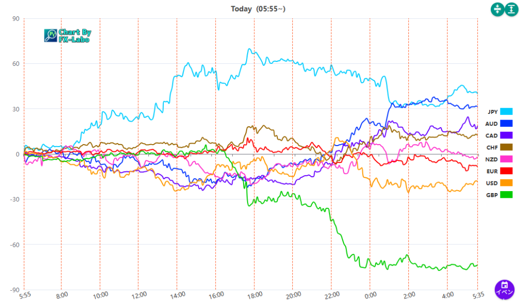 上は、28日の通貨強弱。東京時間午後から円高、ニューヨーク時間後半に戻し、ポンドがニューヨーク時間に下落しました。
