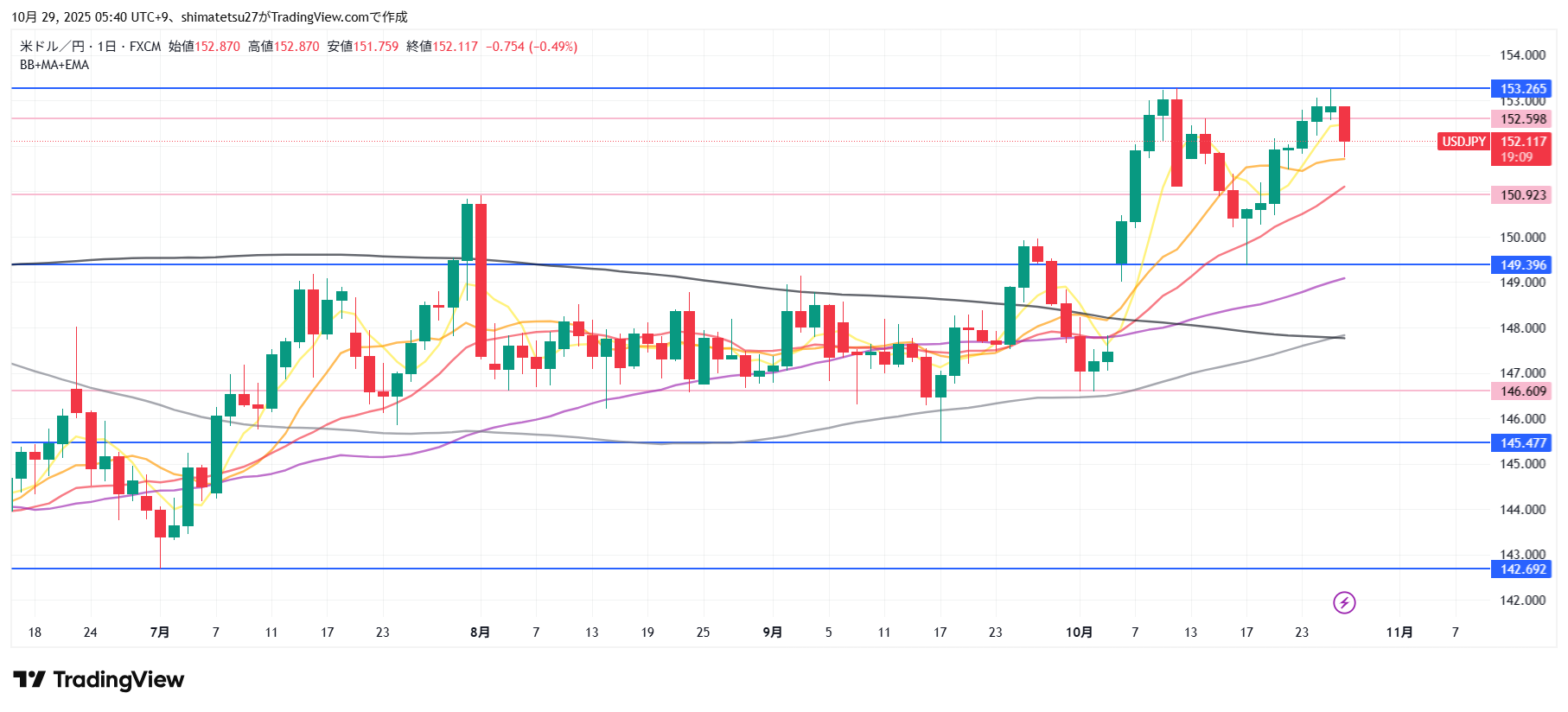 ドル円の日足チャート。10/29 6:00のレートは152.12。次に意識される上のラインは153.26.下ラインは149.39となります。