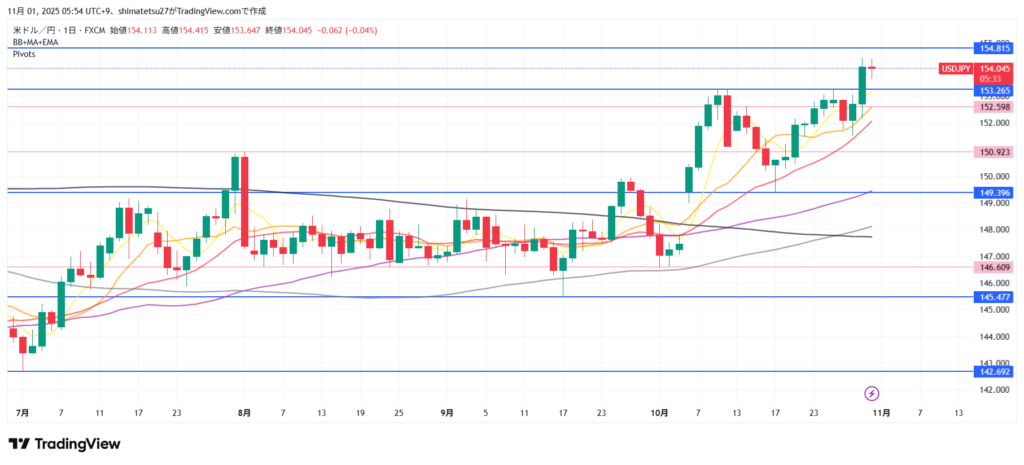 ドル円の日足チャート。11/1 6:00のレートは154.04。上のラインは153.26を超えました。その上は154.81で注目です。.下ラインは149.39となります。