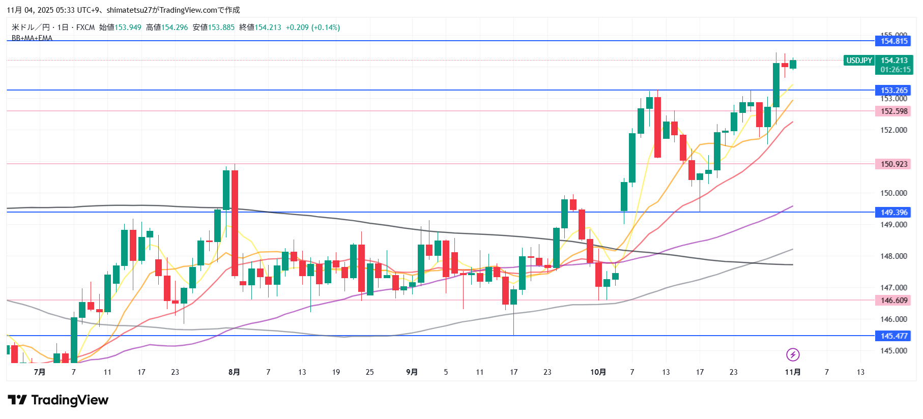 ドル円の日足チャート。11/4 6:00のレートは154.21。ライン153.26を超えました。レジスタンスになるか。その上は154.81で注目です。.下ラインは149.39となります。