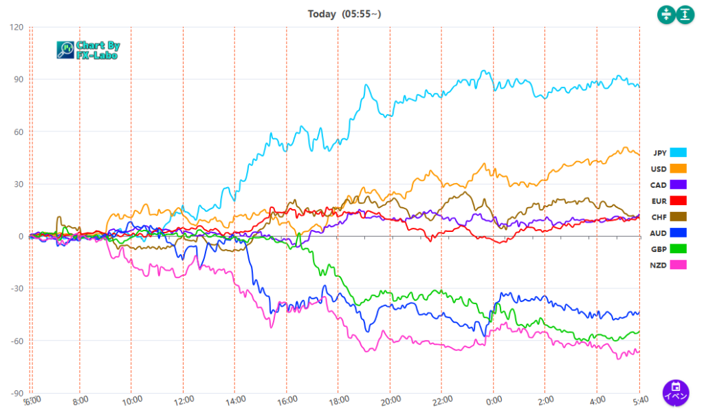 上は、4日の通貨強弱。円高、ややドル高、ポンド、オセアニア安となりました。