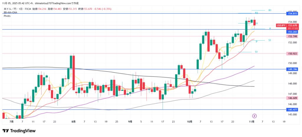 ドル円の日足チャート。11/5 6:00のレートは153.67。ライン153.26を超えました。レジスタンスになるか。その上は154.81で注目です。.下ラインは149.39となります。