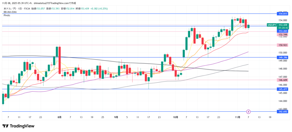 ドル円の日足チャート。11/7 6:00のレートは153.43。153.26のラインを上下する展開。その上は154.81で注目です。.下ラインは149.39となります。続落なるか注目です。