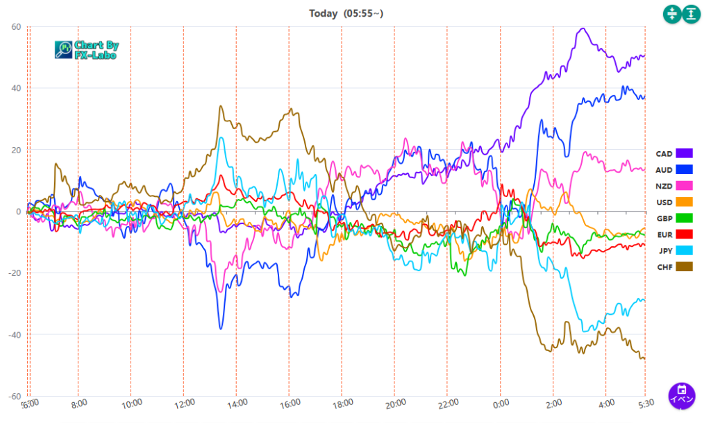 上は、18日の通貨強弱。東京時間とニューヨーク時間で反転しています。円・フランは高から安へ豪ドルは安から高へ、カナダドルがニューヨーク時間に上昇しました。