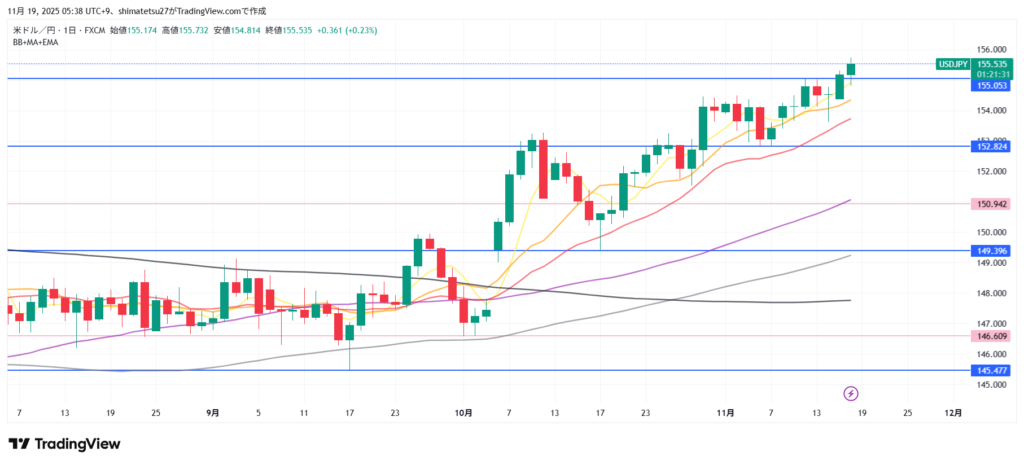 ドル円の日足チャート。11/19 6:00のレートは155.53。17日に実態が155円超えて確定しました。続いてしっかり超えて確定となりそうです。クロス円全体が円安となっています。