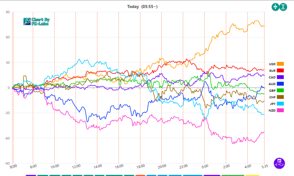 上は、19日の通貨強弱。ニューヨーク時間にドル買いとなっています。ドルインデックスは100を超えて、20日 5:30には100.17となっています。