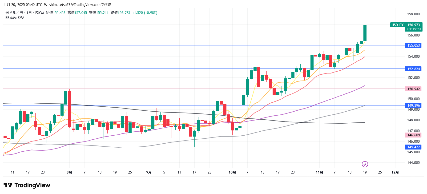 ドル円の日足チャート。11/20 5:30のレートは156.97。17日に実態が155円超えて確定しました。ドル高、クロス円全体が円安となっています。