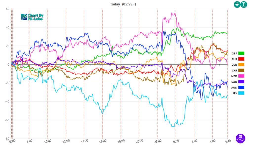上は、20日の通貨強弱。円は、東京時間とニューヨーク時間に売られました。