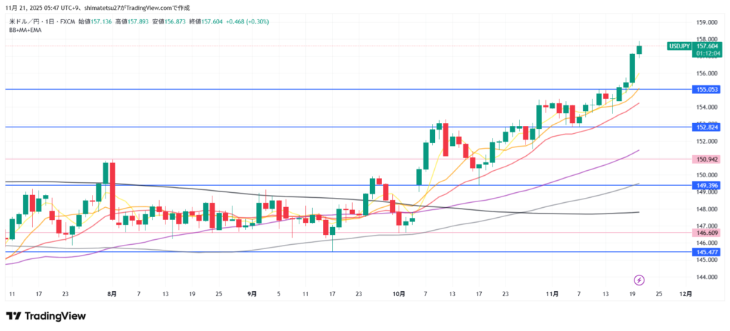 ドル円の日足チャート。11/21 5:30のレートは156.60。17日に実態が155円超えて確定しました。ドル高、クロス円全体が円安となっています。