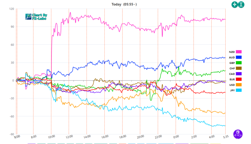 上は、26日の通貨強弱。NZドルが大きな買い。円が売りとなりました。