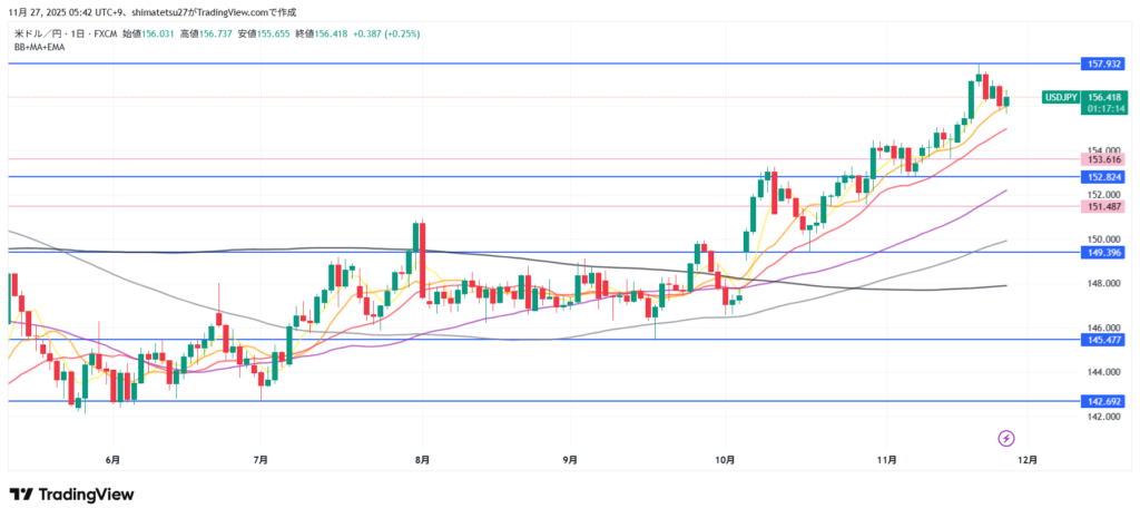 ドル円の日足チャート。11/27 6:00のレートは156.41。17日に実態が155円超えて,ドル高、クロス円全体が円安となっています。