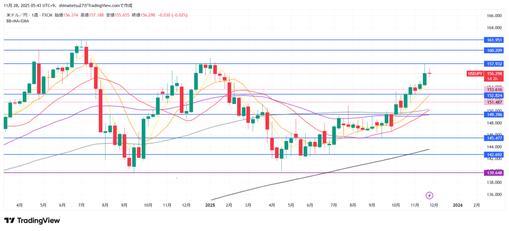 12月のFOMC利下げ観測は87%、日本は円安に対しては牽制してくるので157円で頭打ちを意識したい。