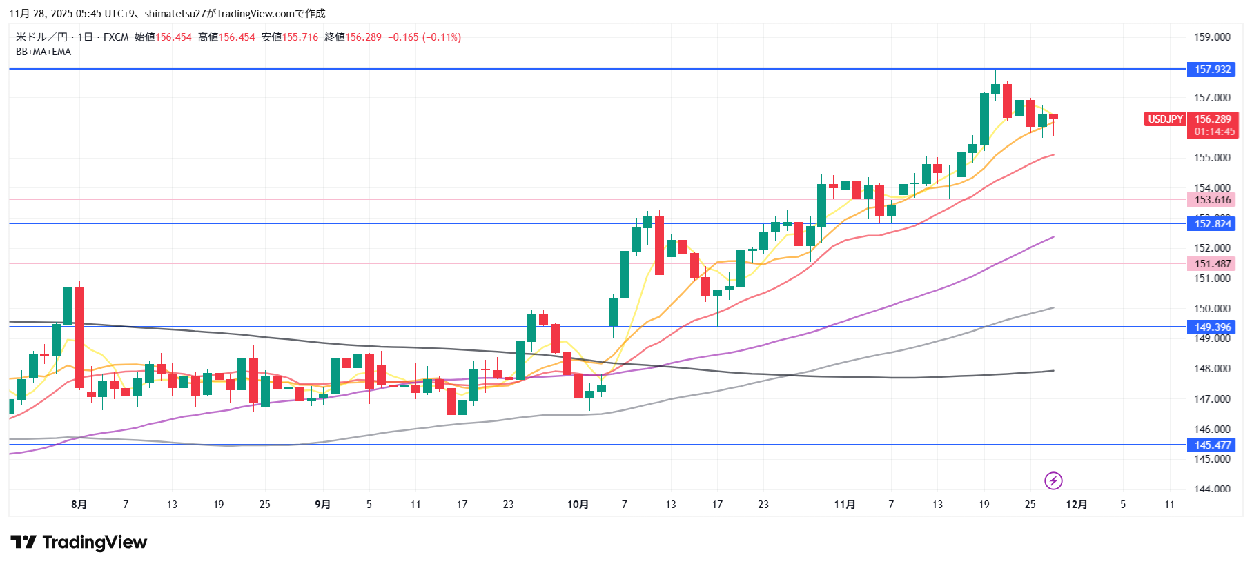 ドル円の日足チャート。11/28 6:00のレートは156.28。17日に実態が155円超えて,ドル高、クロス円全体が円安となっています。