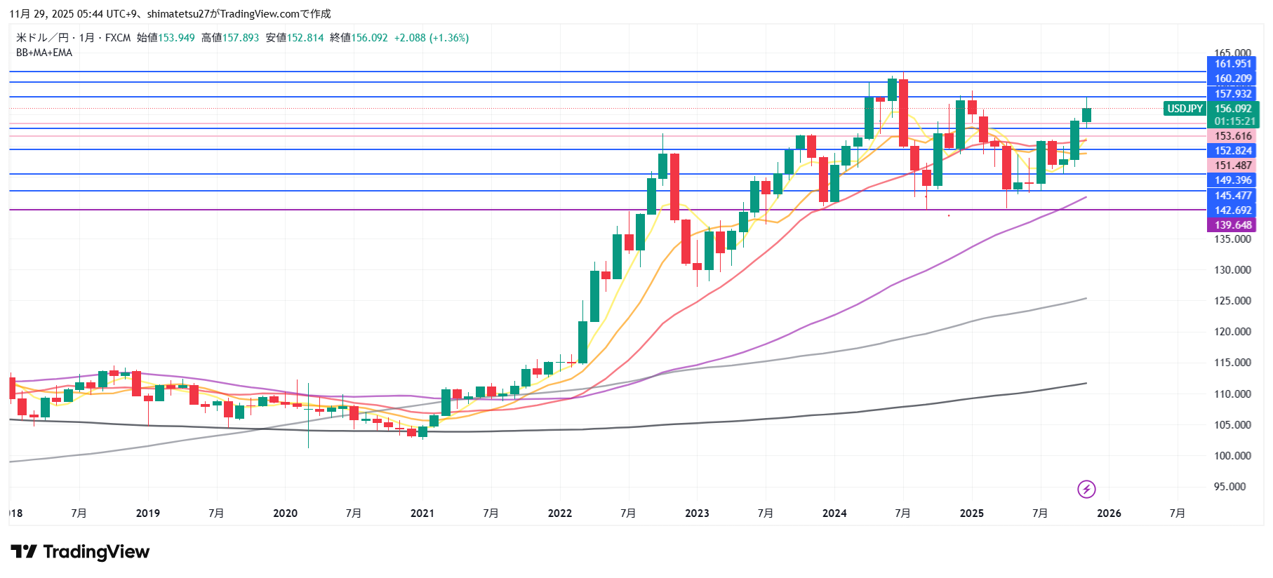 ドル円の日足チャート。11/29 6:00のレートは156.09。17日に実態が155円超えて,ドル高、クロス円全体が円安となっています。