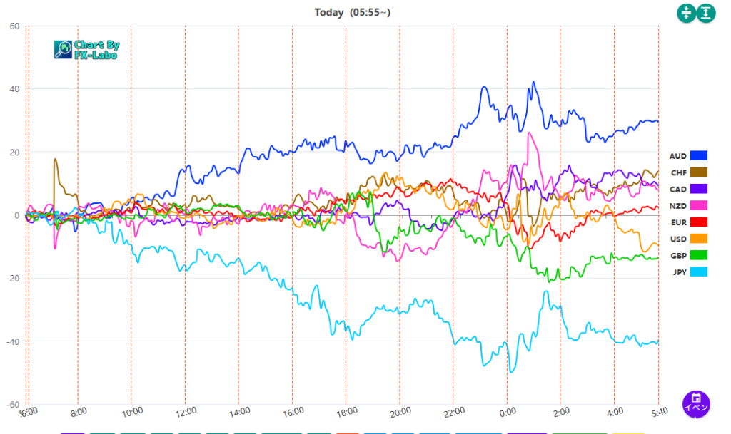 上は、2日の通貨強弱。円が売り。豪ドルに買い、他は小動きとなりました。