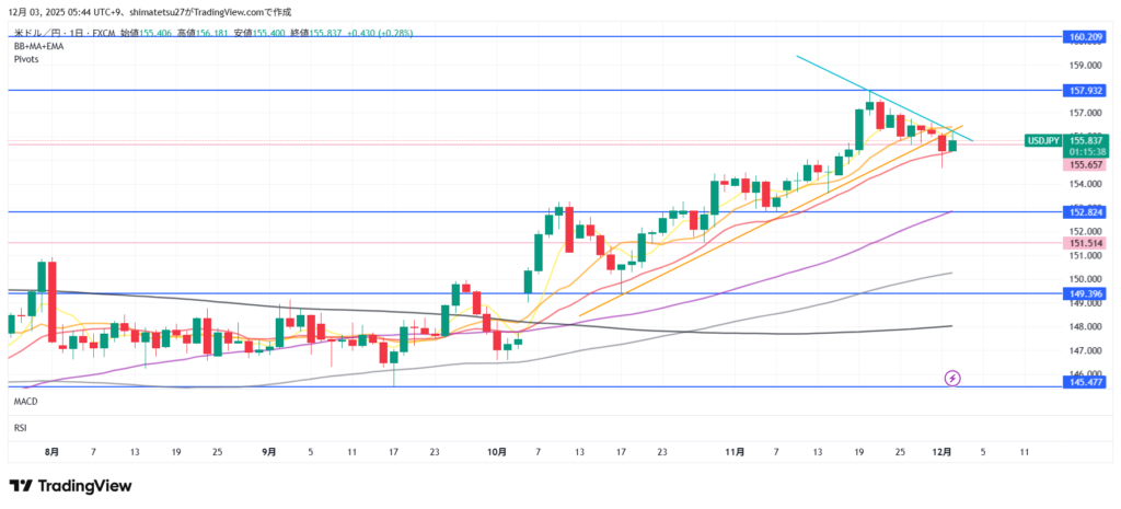 ドル円の日足チャート。12/3 6:00のレートは155.83。17日に実態が155円超えて,ドル高、クロス円全体が円安となっていました。ドル円は下落傾向も2日は反発しました。