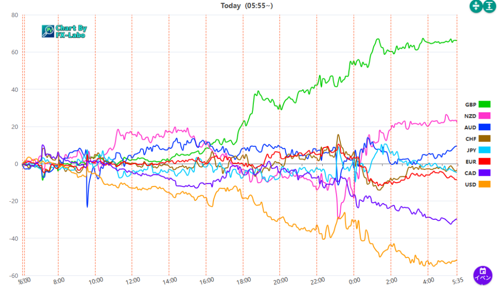 上は、3日の通貨強弱。ドルが売り。ポンドに買い、他は小動きとなりました。
