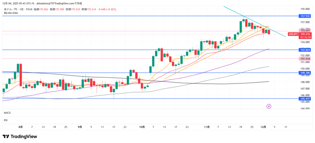 ドル円の日足チャート。12/4 6:00のレートは155.21。17日に実態が155円超えて,ドル高、クロス円全体が円安となっていました。ドル円は下落傾向。